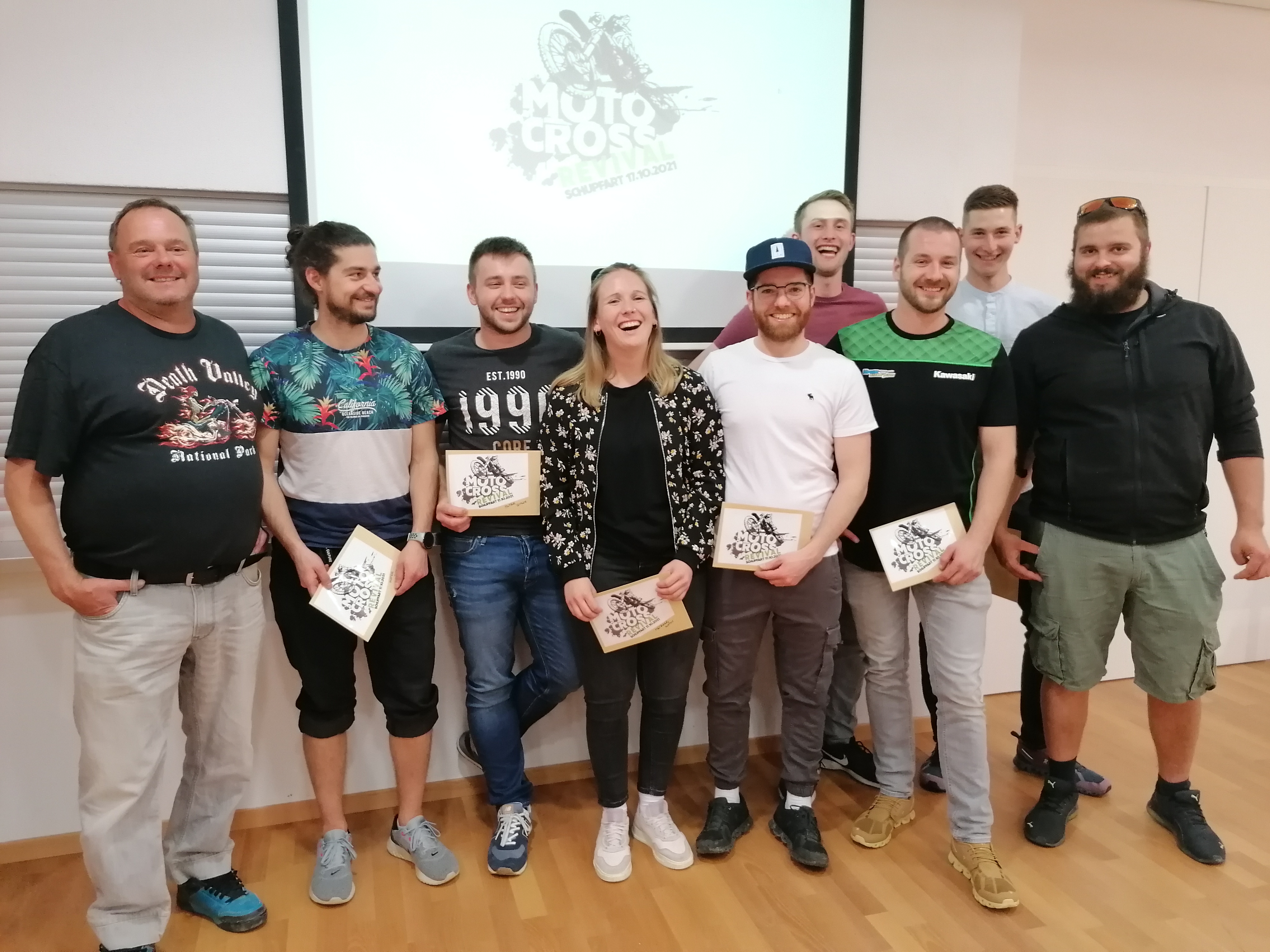 Das Revival-Publikum war super, wofür herzlich gedankt sei. Es wurden 350 Flaschen gespendet und der VMC Schupfart hat den Betrag verdoppelt, sodass alle Nachwuchsfahrer von den Vertretern des VMC Schupfart einen schönen Zustupf an die Unkosten für die Saison 2022 entgegennehmen durften. Die anwesenden Motocross-Veteranen spendeten den Jungspunden viel Applaus und die Freude war gross, wie dem Foto zu entnehmen ist. Mit dem Wunsch auf eine unfallfreie Saison für jung und alt, fand der Abend einen gemütlichen Ausklang.