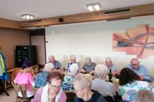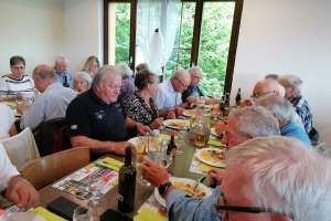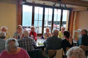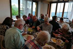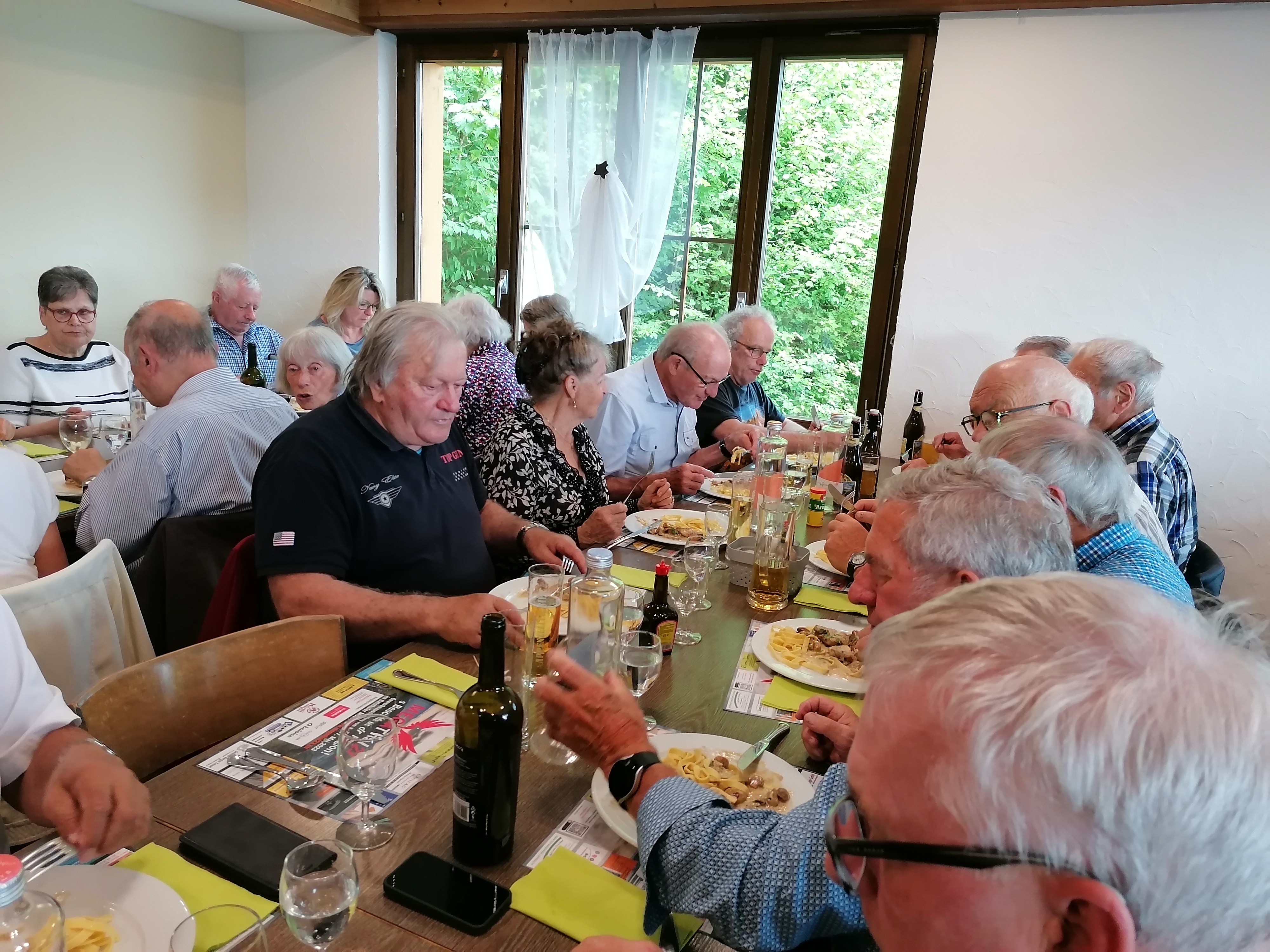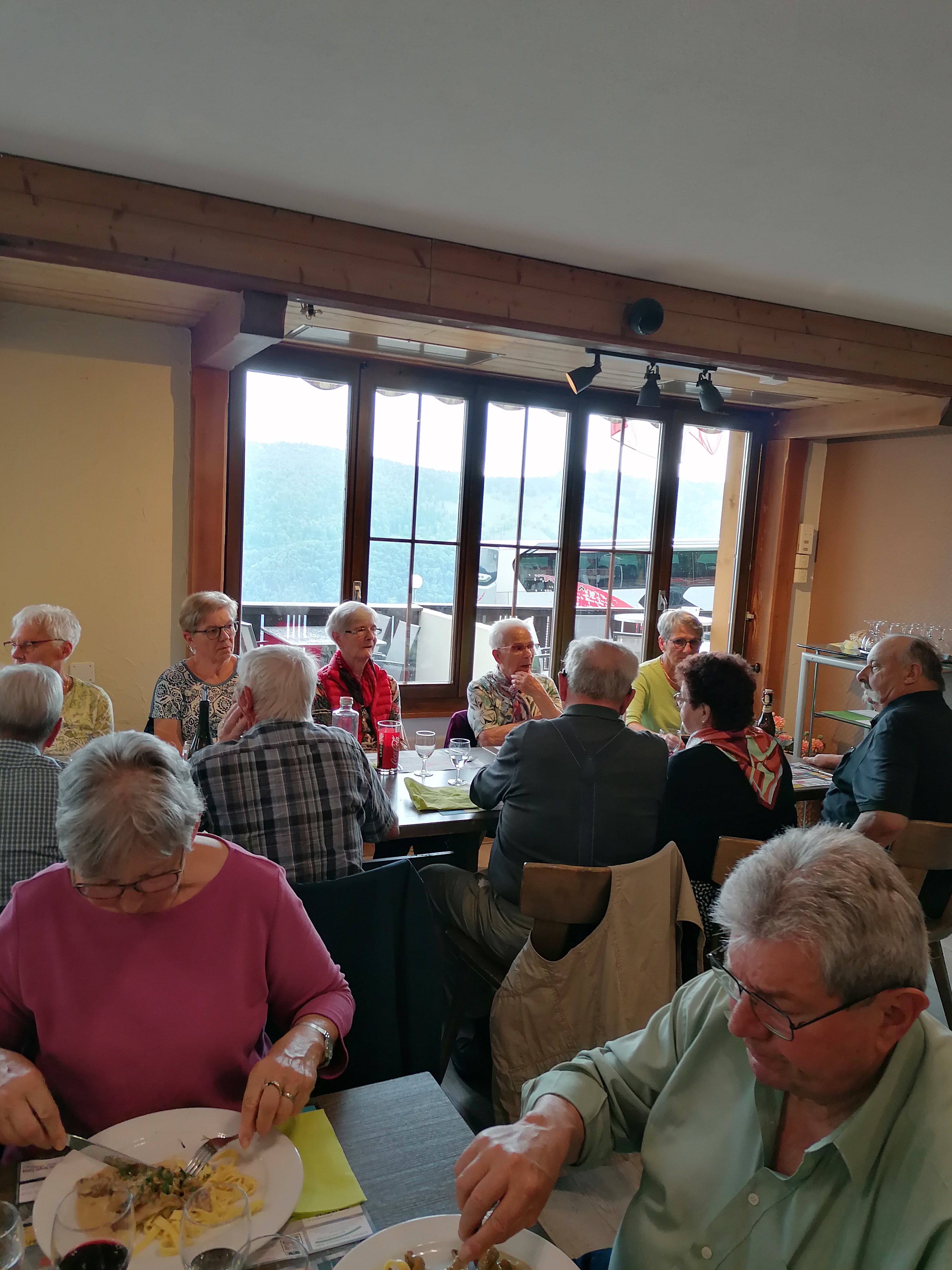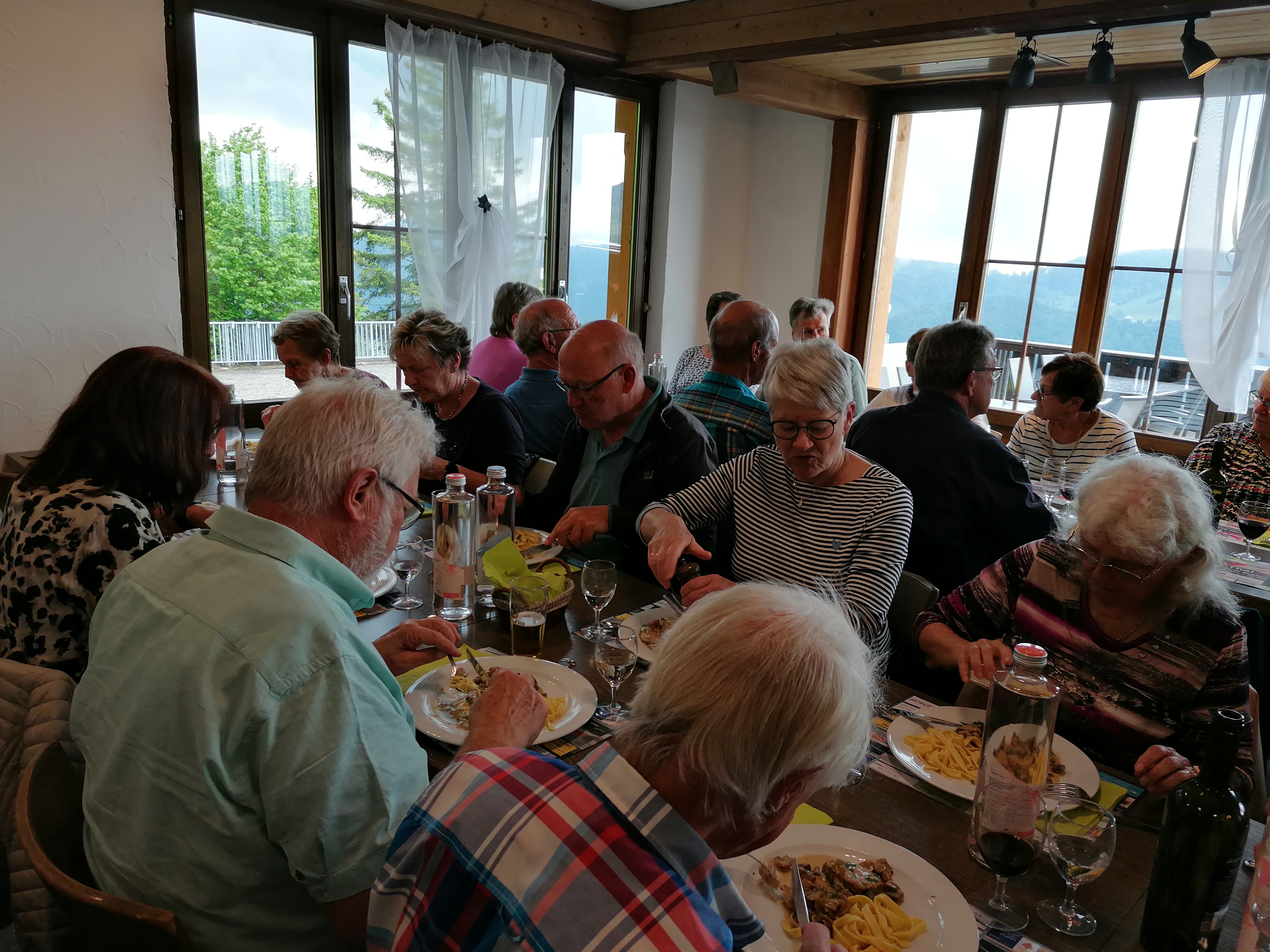 Zur Mittagszeit traf die fröhliche Gruppe im Restaurant auf dem Passwang ein. Zwar hielt sich die Fernsicht wetterbedingt in Grenzen, doch das tat der guten Stimmung keinen Abbruch. Das Essen war hervorragend, der Service sehr fleissig, und das gesellige Beisammensein sorgte für viele angeregte Gespräche und herzhaftes Lachen.